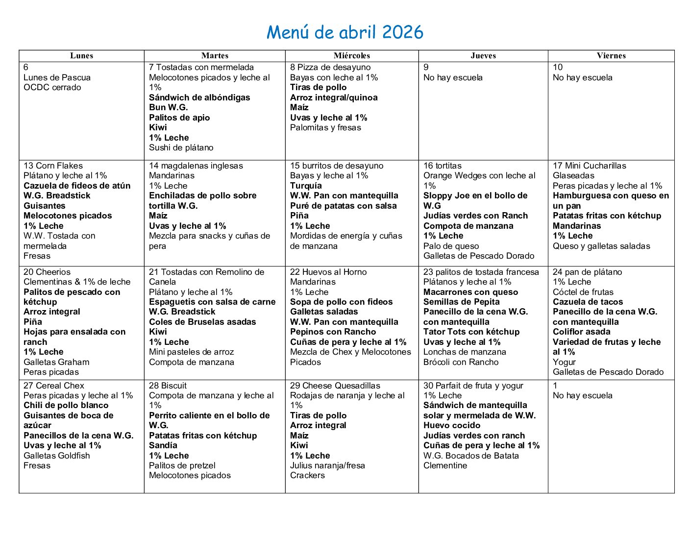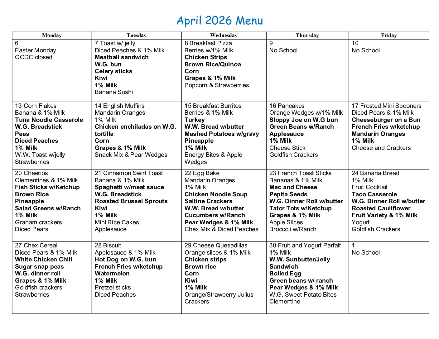 April 2026 Menu